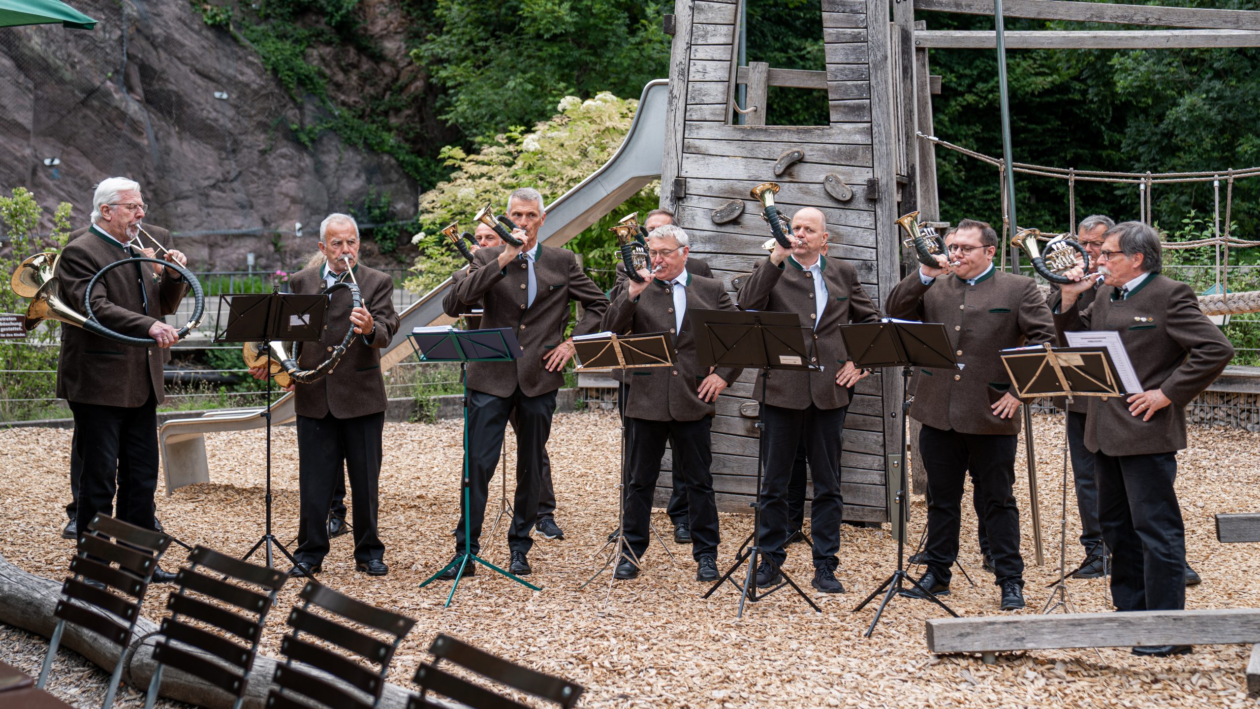 Baden-Baden / Geroldsau, 23.06.2025: Anlässlich des 3-tägigen, internationalen Symposiums der Badischen Stahl-Engineering GmbH (BSE) aus Kehl, haben wir am Abend dieses Montags etwa 250 Mitarbeiter, Kunden und Gäste des Unternehmens zum geselligen Beisammensein in der Geroldsauer Mühle willkommen geheißen und eine gute halbe Stunde mit unseren Jagdhörnern unterhalten.