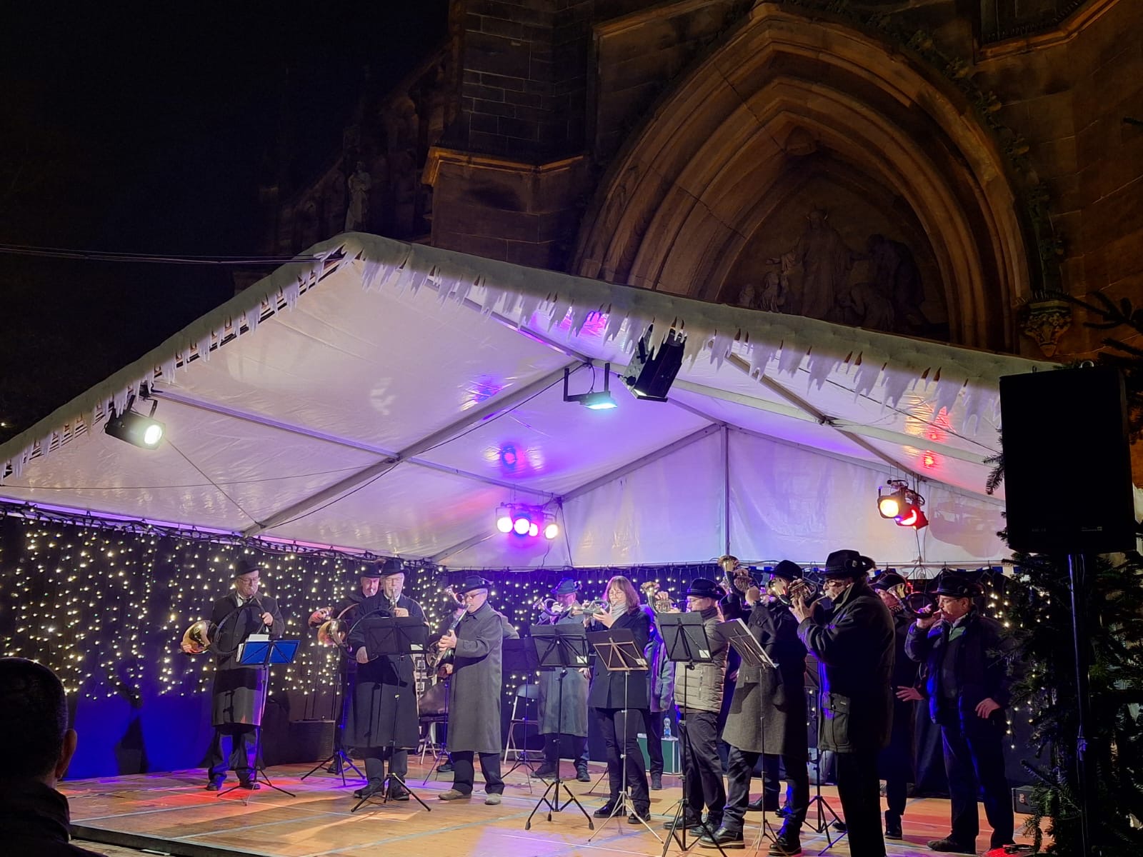 Bühl, 11.12.2025: Wieder einmal gaben wir auf dem Adventsmarkt unserer Heimatstadt Bühl unser Bestes. An diesem Abend, eine halbe Stunde vor der Schließung des Marktes, boten wir den noch zahlreichen Besuchern insgesamt 10 jagdlich konzertante Musikstücke, die meist aus der Feder von Heinz Haag stammten. Insbesondere die Stücke, die auch mit Ventilhörnern geblasen werden, passten ausgezeichnet in die Adventszeit und die Stimmung auf dem Markt vor dem neugotischen Münster St. Peter & Paul zu Bühl. Die Aufmerksamkeit und Reaktion der Adventsmarktbesucher war für uns Anerkennung und Ansporn zugleich!